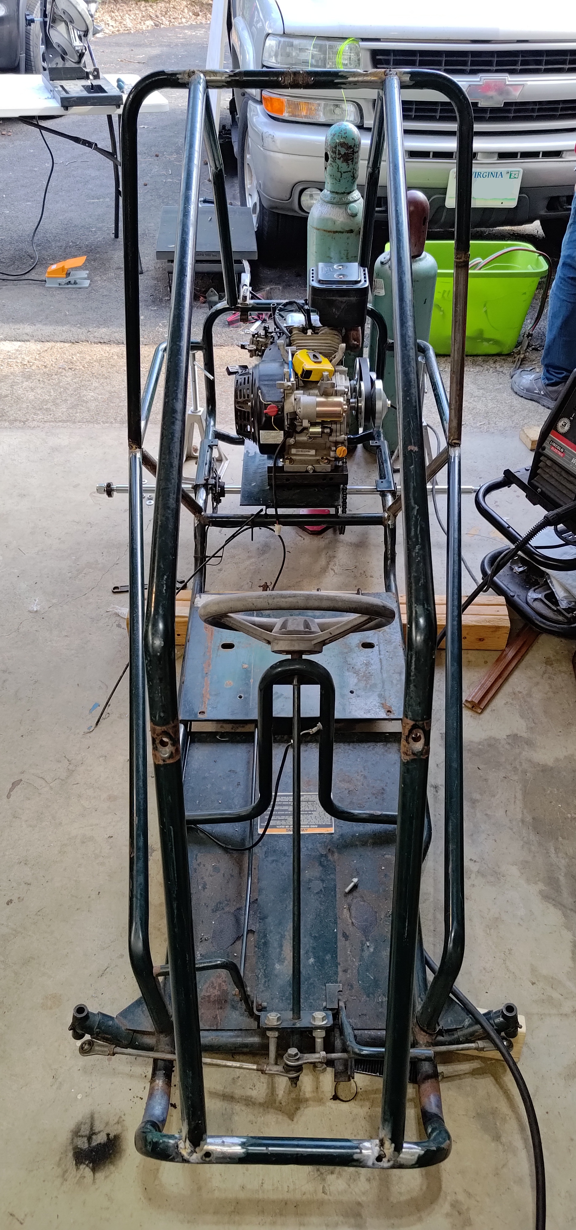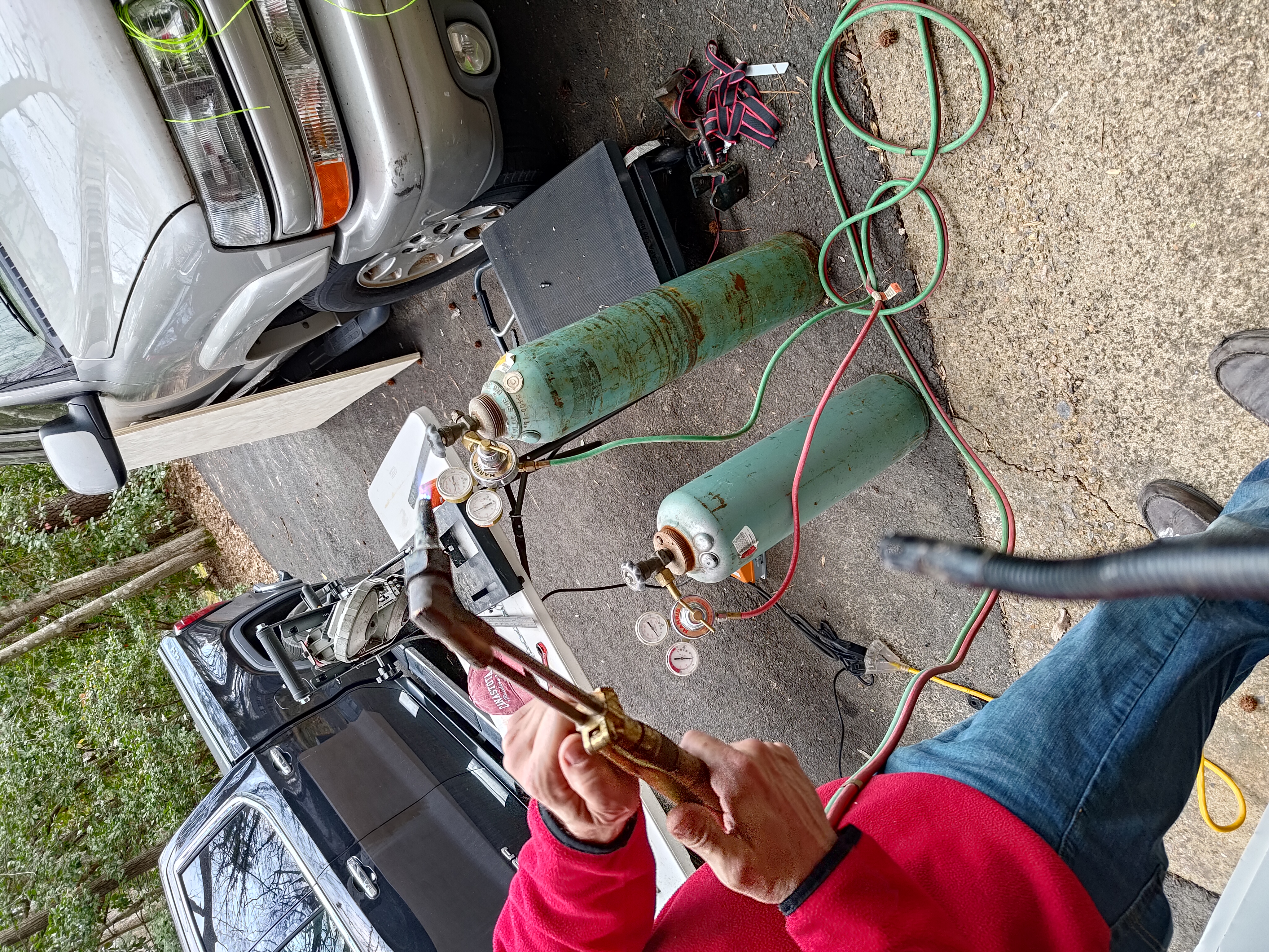 On March 15, 2025, we started to weld the frame together, just tacking the pieces together instead of making final welds as things may change. For the first time I have seen an oxyacetylene torch used in person. With the tanks having Syracuse, New York written on them, it has been a long time since they have been last used.