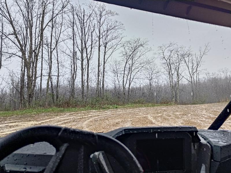 After an hour of driving, we stopped at an open field to take a break. I noticed rain clouds were getting closer and within minutes later, I started to feel raindrops. The light rain immediately turned into a downpour, having us get back to the side-by-side which did not offer that much shelter as there are no windows or a windshield. We had no other choice but to drive back through the water-covered trails. We came up with a plan to get back on the shortest path possible. My father, driving us back, unaware of the fact I did not have my goggles on yet, sped up and we went through the muddy water at high speed, sending muddy water into my unprotected eyes while I cheered in joy. It wasn't that long until I was effectively blinded, needing napkins to get the mud out of my eyes as I could not open them. After that, I put my goggles back on and we continued back.